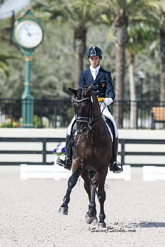 Wellington, FL – January 26, 2014 – Spain’s Juan Matute, Jr. collected another blue ribbon prize after winning the FEI Intermediare Freestyle presented by Chespeake Dressage Institute on Sunday at the Adequan Global Dressage Festival (AGDF). Sixteen-year-old Matute, Jr. and the 11-year-old Hanoverian gelding by Don Frederico finished on a score of 74.400% for victory.