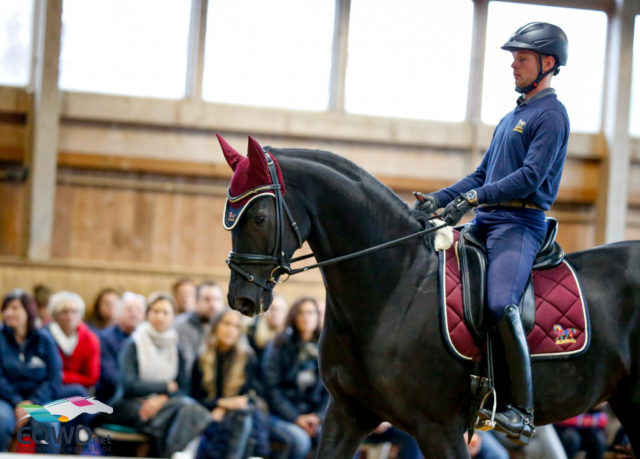 Das offene Training in der holzvertäfelten Reithalle startet mit einem Vierjährigen. Mustergültiges Vorwärts-Abwärts, spielerische Wechsel. „Pferde nie bestrafen, ihnen für schwierigere Lektionen Zeit geben“, erinnern die Gastgeber. Dann der sechsjährige Discover (Don Frederic x Ferragamo) mit Benjamin Werndl. Praktische Tipps für die Gäste, ein Mehrwert der sich durch die Veranstaltung zieht : „Heiße Pferde sollte man nie mit der Hand bremsen. 80% Sitz, 15% Schenkel, 5% Hand ist die Regel!“ Dann Raphael Netz. Der Bereiter stellt den siebenjährigen Hengst Dior v. De Niro vor. Piaffe, Passage, Pirouetten. Das Talent des 20-jährigen Reiters ist unübersehbar. Es geht Schlag auf Schlag. Jetzt schwebt Jessica mit Nachwuchspferd Ferdinand BB (Florencio I x Lanciano) herein. Einhändig, Hand vor und zurück, als wäre es das Leichteste der Welt. Die Passage ist herausragend, hier helfen regelmäßig Andreas Hausberger, Oberbereiter der Spanischen Hofreitschule und Morten Thomson. Und dann der eine, dem sie vieles verdanken: Unee.