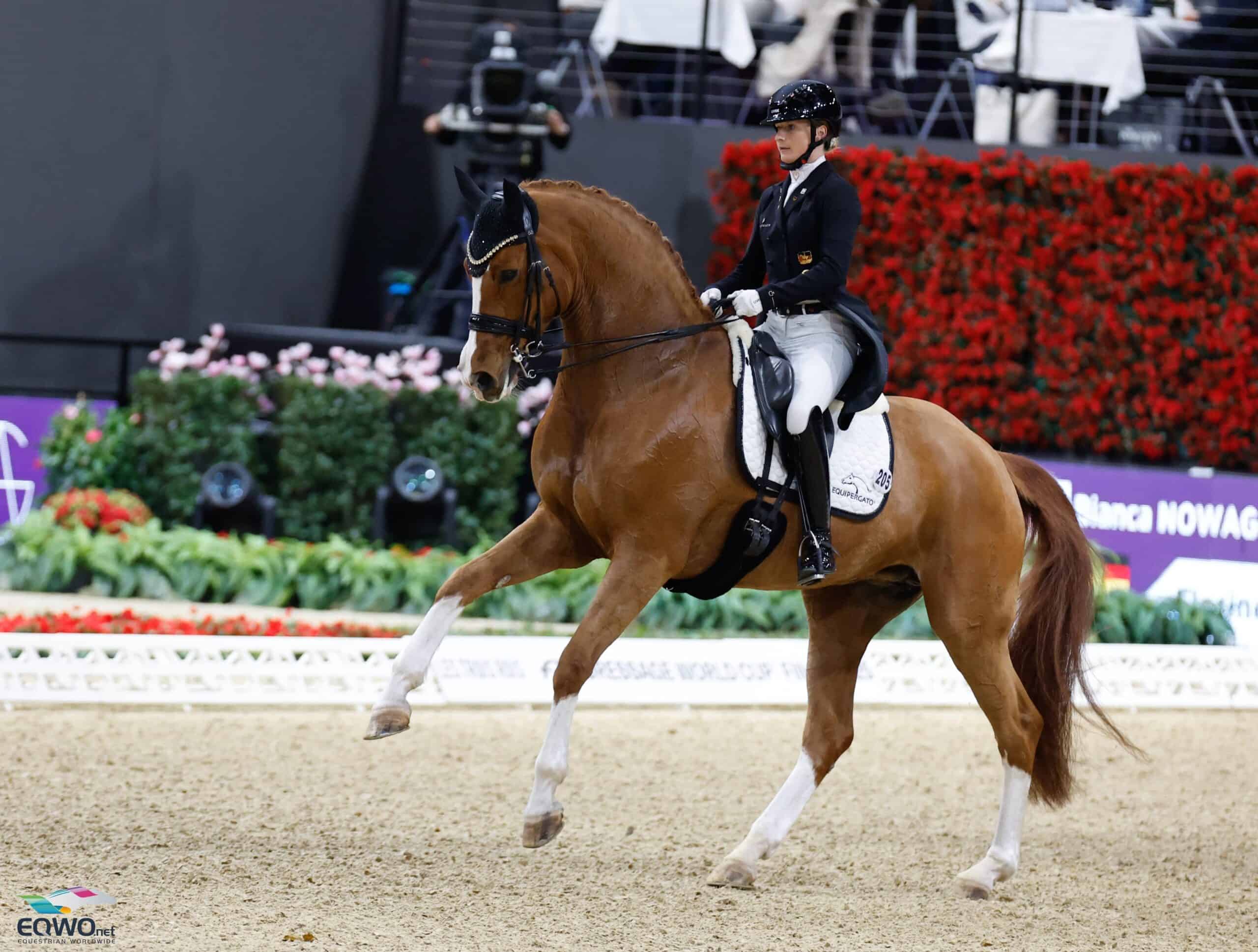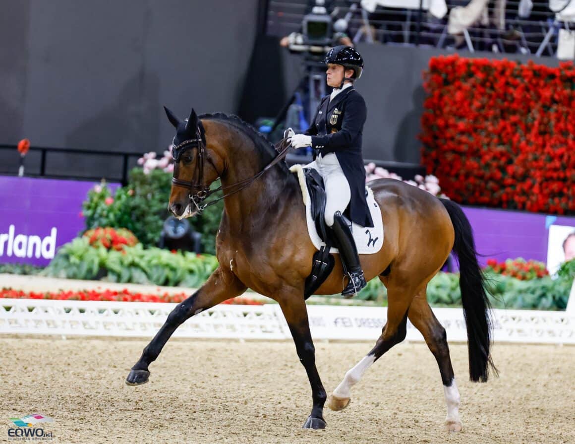 Bronze holte sich ein Oldenburger-Hengst ab, der das Weltcup-Gen in sich trägt: Total Hope OLD. Schließlich konnte Mutter Weihegold OLD das Finale dreimal für sich entscheiden, Vater Totilas holte 2010 in s’Hertogenbosch Gold. Unter Isabel Freese (NOR) hatte der kleine Rappe mit dem großen Kopf etliche Highlights. Besonders in Erinnerung bleiben die nahezu perfekten Zweierwechsel. Insgesamt erhielt das Duo 81,850 %.