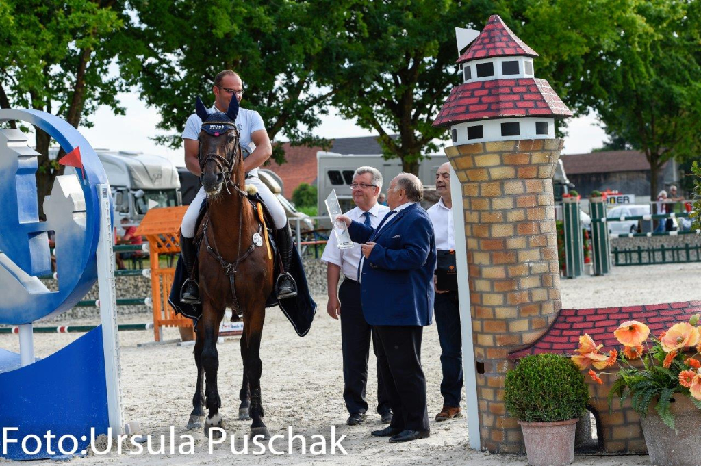 Noch unerfahren ist dagegen Tobias Bachls achtjährige Cicero Z-Tochter Cicera de la Vayrie B. „Es war erst ihr zweiter Parcours über 1,45 m“, berichtete der Chef der gleichnamigen Hengststation. Mit einem Zeitfehler von 0,75 Punkten kam das Duo aus Postmünster auf den dritten Rang. Die Schimmelstute aus Zangersheider Zucht gehört Bachl gemeinsam mit Marie-Jeanette und Heino Ferch, einem bekannten deutschen Schauspieler. „Unsere Familien sind befreundet. Marie-Jeanette und Heino haben mich mit dem Kauf von Cicera unterstützt. Sie entwickelt sich gerade sehr gut und könnte ein Pferd für größere Aufgaben werden“, hofft Bachl. Zwei Jahre lang musste der frühere Nationenpreis-Reiter bei schweren Springen zuschauen. Eine Brandkatastrophe zerstörte im August 2013 einen großen Teil des Traditionsgestüts. 28 Pferde kamen ums Leben, darunter auch die Top-Sportler der Geschwister Tobias und Judith. „Ich bin froh, dass ich in diesem Jahr wieder ins Bayernchampionat einsteigen kann. Wir Reiter sind der NÜRNBERGER Versicherung und insbesondere Herrn Priller sehr dankbar für die Unterstützung. Es ist nicht selbstverständlich, dass ein Sponsor zehn Jahre lang dabei bleibt“, sagte Bachl.