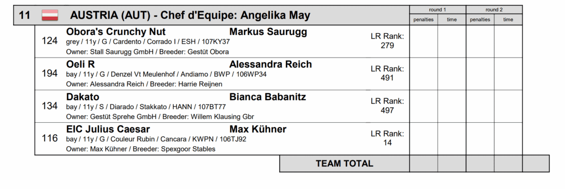 Heute (27.6.) ab 15 Uhr heißt es Daumen drücken für das rot-weiß-rote Quartette, welches jeweils mit Startnummer elf von zwölf Teams ins Renne geht. Equipe-Chefin Dr. Angelika May hat ihre Auswahl bereits gestern bekannt gegeben: Markus Saurugg (OÖ) und der elfjährige Cardento-Nachkomme Obora’s Crunchy Nut sind das erste Duo für Österreich. Als zweite Starterin folgt dann Alessandra Reich (OÖ) mit ihrem BWP-Wallach Oeli R. Die Burgenländerin Bianca Babanitz (B) ist im Sattel ihres Diarado-Sohns Dakato die dritte rot-weiß-rote Reiterin. Österreichs Nummer 1 im Springsport Max Kühner (T) ist als Schlussreiter angeführt. Er wird den elfjährigen Couleur Rubin-Sohn EIC Julius Casear über den 150 cm hohen Parcours pilotieren.