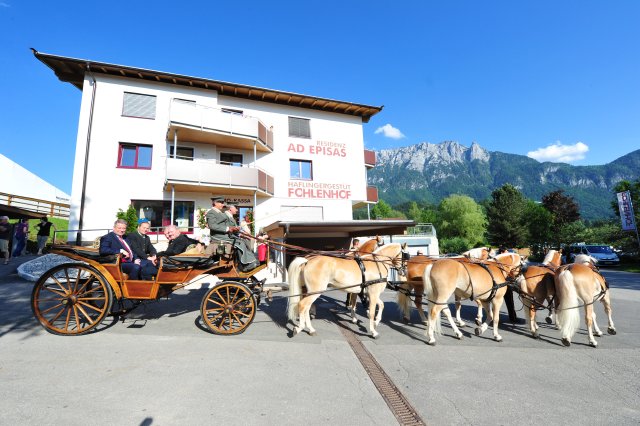 Auch die große Schar an politischen Vertreter aus den Bundesländern Tirol, Vorarlberg und Südtirol sowie Österreichs zeigten mit Ihrem persönlichen Besuch Ihre Wertschätzung und Interesse am Tiroler Kulturgut Haflinger. So ließ es sich Bundesminister Andrä Rupprechter nicht nehmen, nach standesgemäßem Einzug mit dem Fohlenhof 6-Spänner, begleitet von LH-Stellvertreter Josef Geisler, dem Ebbser Bürgermeister Josef Ritzer u. dem Geschäftsführer vom Fohlenhof Ebbs, DI Rudolf Hussl – feierlich die Haflinger Weltausstellung zu eröffnen. Die nachfolgende Int. Haflinger Show begeisterte die bis auf dem letzten Platz ausverkaufte Fohlenhof Arena.