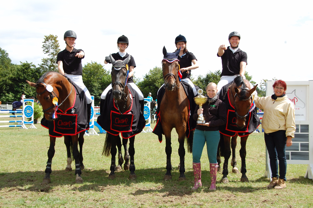 „Es ist immer wieder schön zu sehen, was die Mannschaften hier gemeinsam auf die Beine stellen“, fand Ann-Kristin Baumann von der Hauptgenossenschaft Nord AG, mit ihrer Marke Champ Hauptsponsor der Serie. „Dass die Reiter diesen Teamgeist haben, ist einfach das Besondere an der Champ Trophy.“ Ihren Zusammenhalt zeigten die Reiter auch äußerlich, der Reitverein Westwalddistrikt präsentierte sich zum Beispiel mit lustigen Bommelmützen und Schabracken in Vereinsfarben. Auch die Felmer Reiter schmückten ihre Pferde mit bestickten Schabracken, waren mit bedruckten Jacken und T-Shirts außerdem für jedes Wetter gerüstet und sprangen in diesem Outfit auf den vierten Platz. Vorjahressieger Raisdorf kennzeichnete sogar seine Fans anhand von Team-T-Shirts, musste sich diesmal aber mit dem achten Platz zufrieden geben.