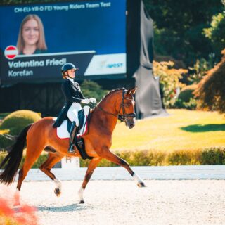Österreichs dritte Reiterin im Grand Prix, Astrid Neumayer, startete heute kurz vor 10 Uhr und lag mit ihrem 11-jährigen Sir Simon 12 (Samarant x Florestan I) lange Zeit auf einem Score um die 72 Prozent. Doch am Ende der Zick-Zack-Traversale sprang ihr Fuchswallach in den Kreuzgalopp. Ein teurer Fehler, den die Oberösterreicherin auch in den Einerwechseln zu spüren bekam und nachfolgend sank der Score auf 68 Prozent. Schade, denn mit der Endnote von 68.727 % war Astrid heute das Streichergebnis der rot-weiß-roten Dressur-Equipe.