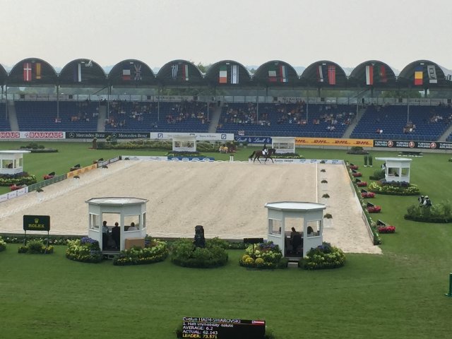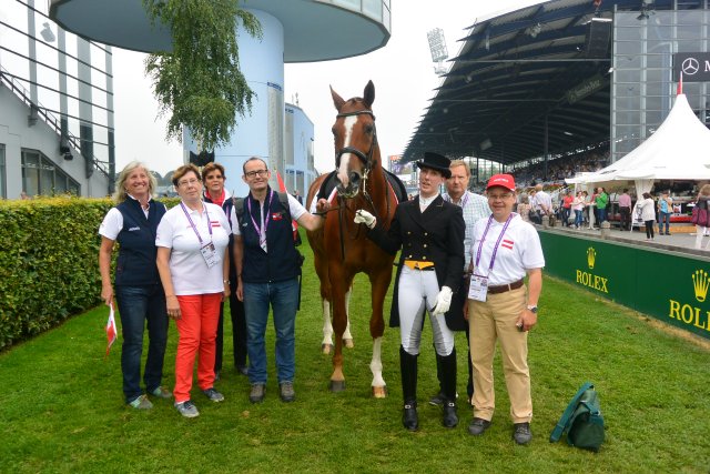 Zuerst jedoch durfte man einmal mit der jungen Wienerin Alexandra Slanec mitjubeln. Unglaublich mit welcher Coolness sie heute in das beeindruckende Stadion einritt! Sie bekam nie unter 6,2 Punkte, zeigte beeindruckende Wechsellinien, gelungene Zweier und leistete sich lediglich beim Übergang nach der Piaffe eine Unstimmigkeit. „Eigentlich war ich darauf gefasst nervös zu sein, aber diese tolle Atmosphäre hier nimmt einen richtig mit. Ich habe mir vorgenommen eine lockere und schöne Runde zu reiten und das ist mir gelungen. Ich bin wirklich stolz auf uns!“ Stolz war auch das ganze Team und vor allem Mama Berta, die nach dem gelungenen Grand Prix Tränen der Rührung vergoss. Verständlich, denn mit 66,942 % gab ihre Tochter ein solides EM-Debüt im so berühmten Pferdesport-Mekka Aachen ab.