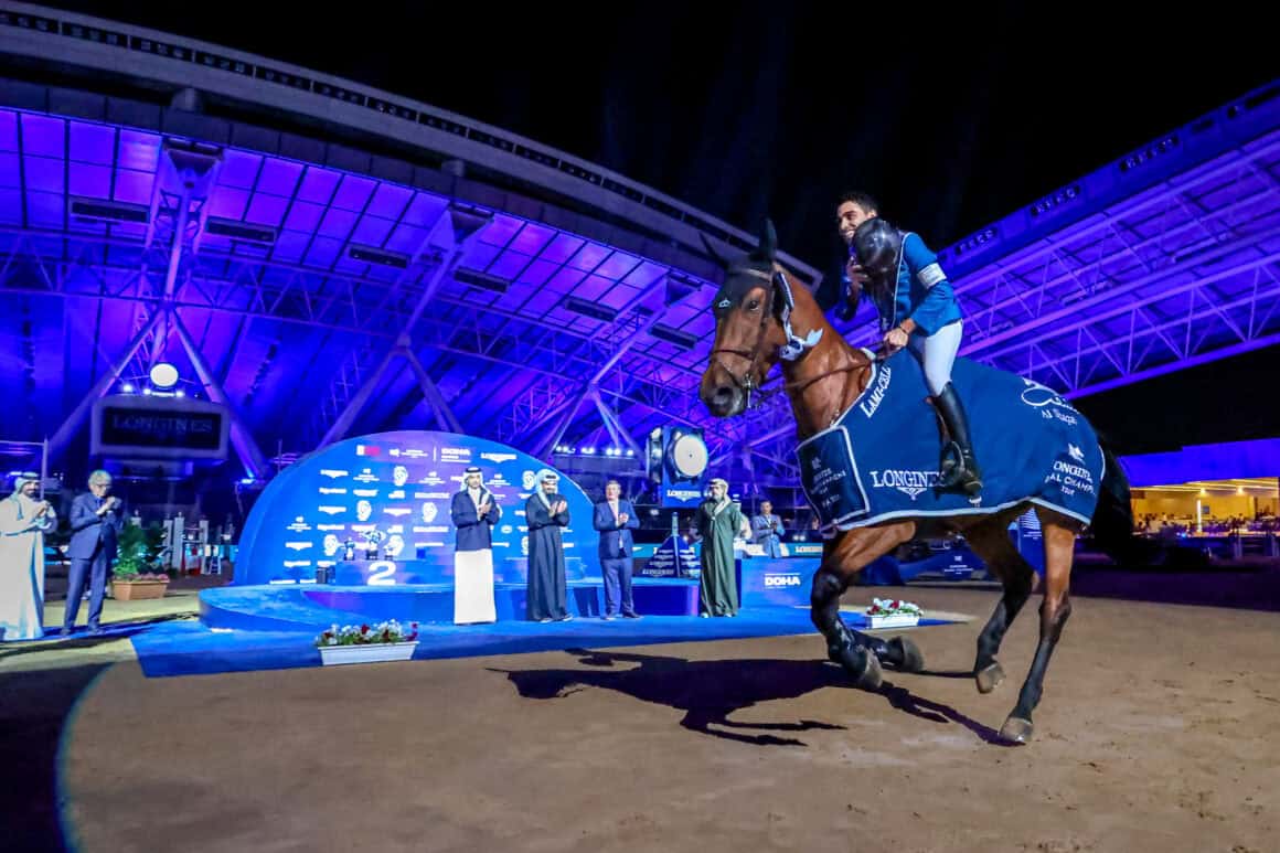 Die erste Doppelnull des Abends lieferten Daniel Deusser (GER) und der 14-jährige KWPN-Wallach Gangster v/h Noddevelt in einer Zeit vom 39,52 Sekunden. Abdulrahman Alrajhi (KSA) und der Van Helsing-Sohn Ventago zeigten ebenfalls einen starken zweiten Umlauf ohne Fehler. Allerdings kam sie an das Tempo des Deutschen nicht ganz heran und galoppierten bei 40,35 Sekunden über die Ziellinie. Nach einigen Vier-Fehler-Ritten pilotierte Marcus Ehning den zwölfjährigen Holsteiner-Wallach Coolio fehlerfrei über die Hindernisse. In einer Zeit von 41,67 Sekunden belegte er damit den dritten Zwischenrang. Doch dann kamen der spätere Sieger Abdel Saïd (BEL) und seine Ausnahmestute Bonne Amie in die Arena mit dem Ziel den Grand Prix vom Doha nach 2024 zum zweiten Mal in Folge zu gewinnen. Fehlerfrei in einer Zeit vom 38,25 und über einer Sekunde Vorsprung setzte sich der gebürtige Ägypter an die Spitze des Feldes.