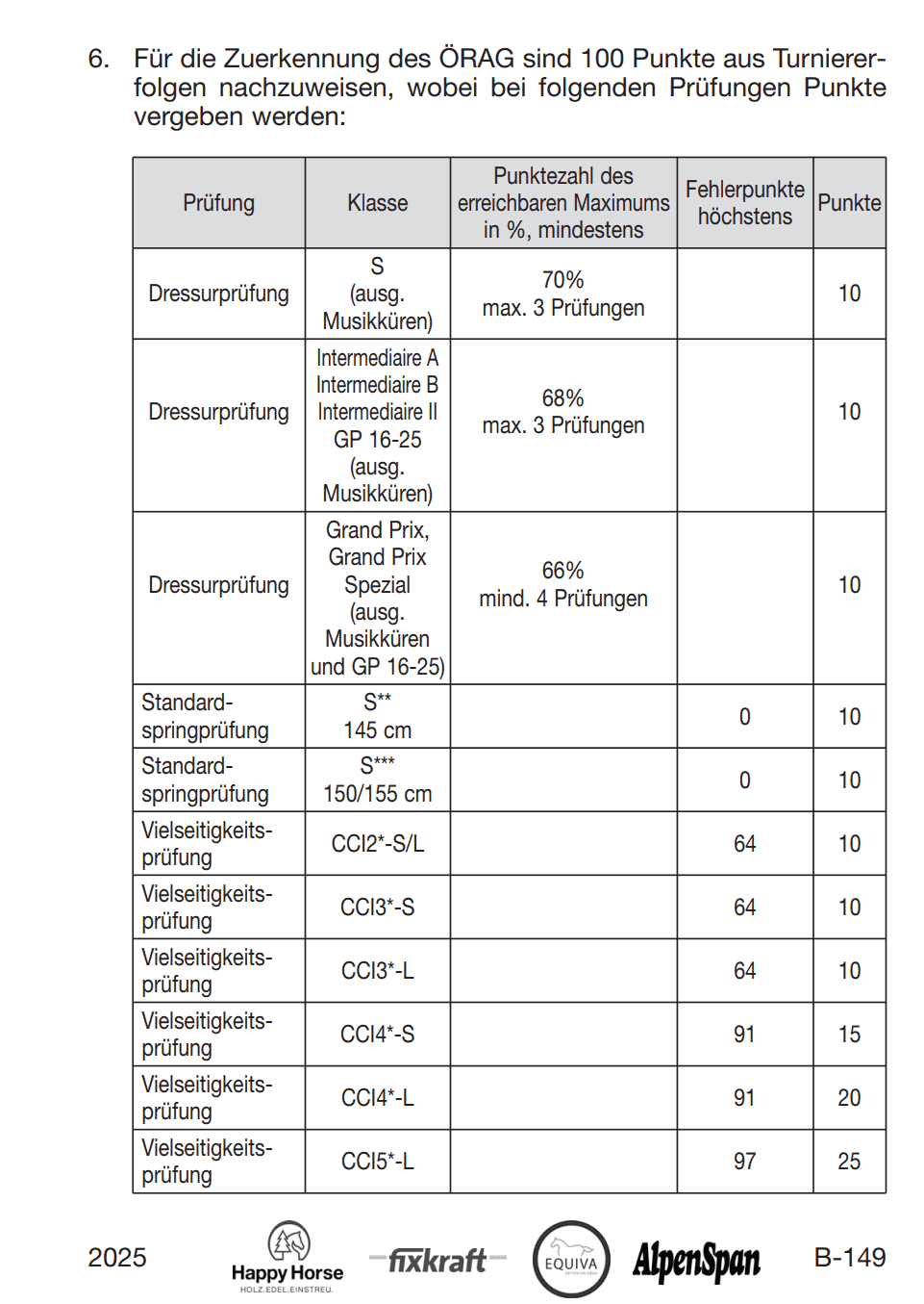 Für die Verleihung des goldenen Reitabzeichens in der Dressur, im Springen oder in der Vielseitigkeit sind 100 Punkte aus Turniererfolgen vorzuweisen. Für Ergebnisse in internationalen Vielseitigkeitsprüfungen ab der Kategorie Zwei-Sterne gibt es Punkte für das goldene Reitabzeichen, wobei erst ab Vier-Sterne ein unterscheid zwischen Kurz- und Langprüfungen gemacht wird: