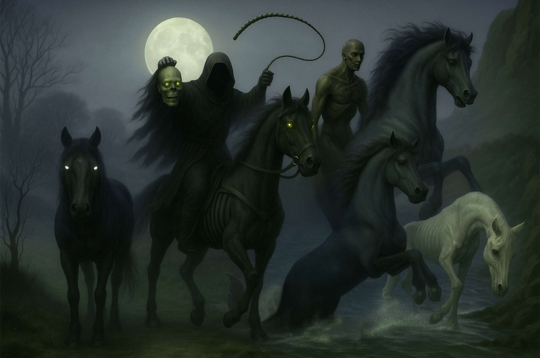 Pferde – „Nuckelavee“, „Helhest“ oder „Dullahan“: Pferde sind besonders auf den britischen Inseln oft Hauptfiguren von schaurigen Mythen und Legenden. Die Top-5 gruseligsten Pferdewesen und ihre Reiter!