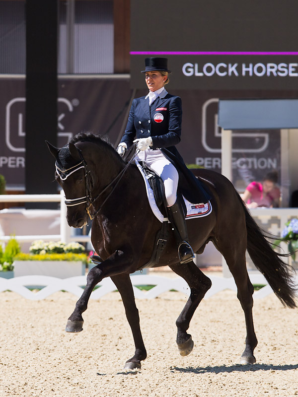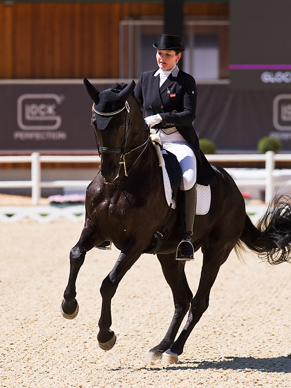 Isabelle Steidle (GER) ritt mit ihrem 14-jährigen nach Langenhagen x Concerto II gezogenen Holsteiner Long Drink als letzte Starterin in den Bewerb ein und lieferte die beste Leistung ab. Drei der fünf internationalen Richter sahen sie auf Platz eins und der Gesamtscore von 70,620 % bedeutete ganz klar den Sieg. „Gleich beim ersten Auftritt hier zu gewinnen ist einfach grandios. Wir fühlen uns sehr wohl und die Bedingungen sind optimal“, so die strahlende Siegerin Isabelle Steidle.