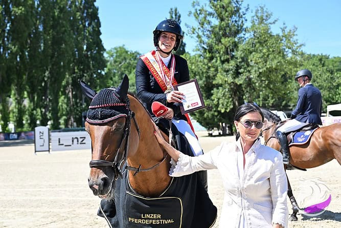 Nach ihrer Babypause krönte sie heute ihr gelungenes Comeback im großen Stil: Mit ihrem Herzenspferd Chappelloup verteidigte sie souverän ihren Titel vom Vorjahr und wird auch Österreichische Staatsmeisterin im Springreiten 2025.