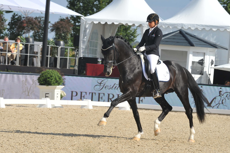 Bereits am Mittag hatte Dorothee Schneider Sieg Nummer eins bei der Peterhof Dressur Gala 2015 gefeiert. Bei der internationalen Prüfung für die fünfjährigen Dressurpferde dominierte die Pferdewirtschaftsmeisterin im Sattel des Baden-Württemberger-Wallachs First Romance. Auch hinter diesen Sieg setzte sie ein deutliches Ausrufezeichen: Mit der Note 9,28 ließ sie die Zweitplatzierte Kristine Möller auf der Trakehner Imperio-Tochter Standing O’Vation mehr als einen Notenpunkt hinter sich. Standing O’Vation erhielt die Endnote 8,04.