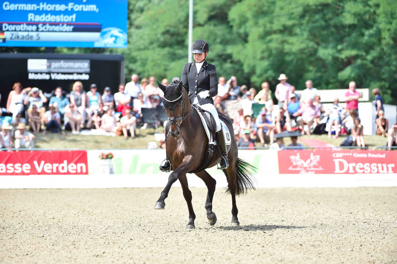 Mit einem achten Platz hat die Trakehner Stute Zikade unter der Regie von Dorothee Schneider die Weltmeisterschaften der Jungen Dressurpferde in Verden beendet. In der hochklassigen Konkurrenz der fünf Jahre alten Pferde erhielt die 2010 geborene dunkelbraune Tochter des Singolo aus einer Tambour-Mutter die Gesamtnote 8,28.